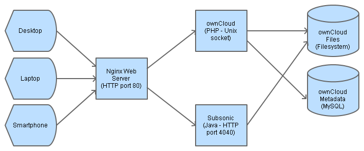We will setup an Nginx web server as the front-end, and install ownCloud in the context /owncloud and Subsonic in the context /subsonic. For ease of access, instead of relying on Subsonic's rudimentary upload interface or some external method, we will configure Subsonic to index and play files from folders Audio and Video in the ownCloud installation.