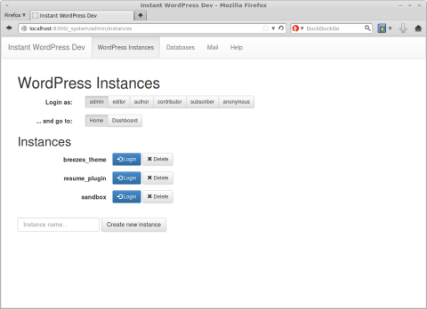 Instant WordPress Dev is a WordPress development environment designed to be easy and fast to install. It provides a control panel in which you can create and destroy WordPress instances with just a few clicks.